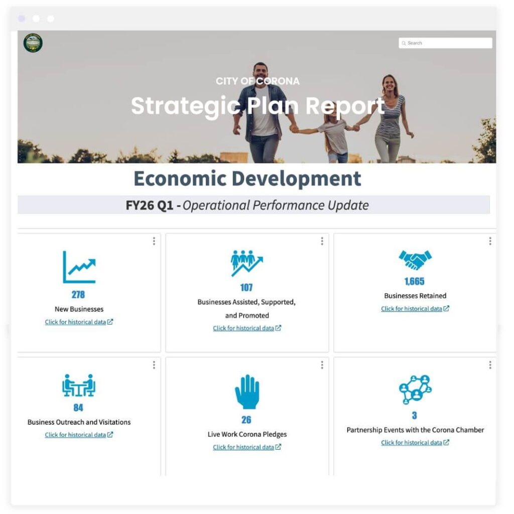 Corona uses various KPI reports, such as their economic development report, which lets residents and leaders track performance metrics and initiative progress.