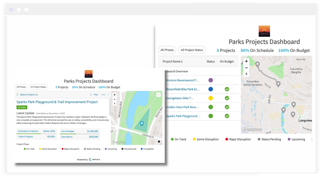 Some of the most-visited Envisio Projects public dashboards include road resurfacing programs, stormwater upgrades, park improvements, and safe-routes-to-school projects—exactly the kinds of highly visible, neighborhood-impacting efforts residents always want updates on.